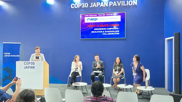11月18日に行われたのが、ジャパンパビリオンでのNHKエンタープライズ主催のセミナー「気候危機を食い止めるために -ステークホルダーの連携による啓発活動と環境教育-」です。セミナーは英語で行われ、日本人だけでなく、地元ブラジルやアフリカからの来場者も含め、たくさんの人々が参加しました。