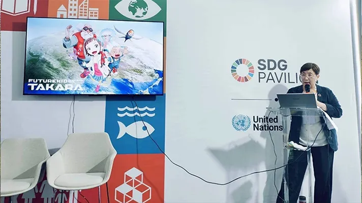 11月20日に行われたのが、国連SDGパビリオンでのセミナー『「1.5℃の約束」 メディアの連携とアニメを使った環境教育』です。プレゼンターは堅達プロデューサーが務め、主に海外からの観客が参加しました。こちらのセミナーでは、1.5℃の約束についてのより詳しい紹介と、「FUTURE KID TAKARA」についても、より多くの上映が行われました。