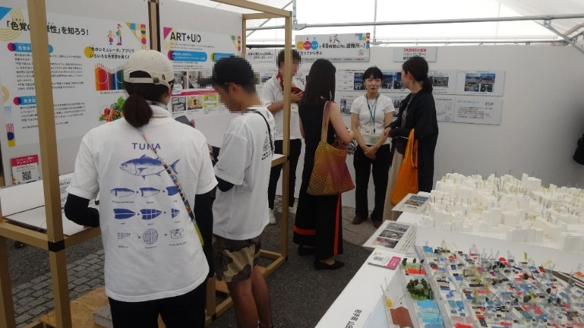NHKアートは「情報を伝える」をテーマに、ユニバーサルデザインの取り組みや、雨量・風量をリアルタイムに可視化する自社開発システムを展示しました。展示什器にはサステナブルな素材を使用し、前回の出展時の資材をリユース。