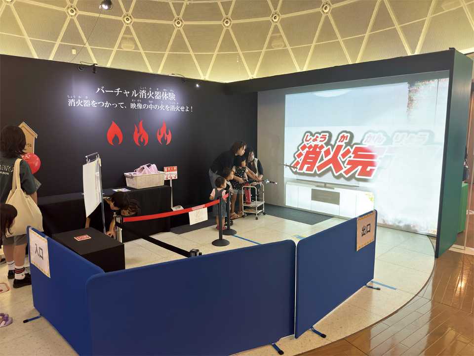 本物の消火器をベースにしたNEPオリジナルの疑似消火器を使い、スクリーンを前に初期消火のバーチャル体験ができるコンテンツです。