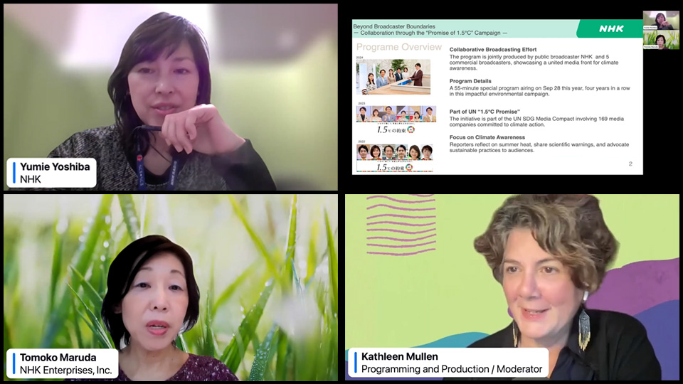 NHK 総務局 環境経営事務局とNHKエンタープライズ SDGsプロジェクトは、NHKグループと民間放送がメディアの垣根を越えて取り組む気候アクション・キャンペーンを紹介しました。2022年から始まり4回目となる環境スペシャル番組のテーマは「最新技術でガマンしない!みんなが得する温暖化対策」です。共同制作に参加した6局を代表するアナウンサーが、NHKのスタジオに集まり、史上最も暑かった今年の夏を振り返り、科学者からの警告も交えながら、気候アクションを呼びかけました。また、6局連動ならではの演出やSNS展開も紹介しました。さらに、日本には脱炭素に取り組むための放送業界団体が存在しないため、番組制作をきっかけに始まった勉強会が、先進事例や課題を共有する貴重な場となっていることも述べました。